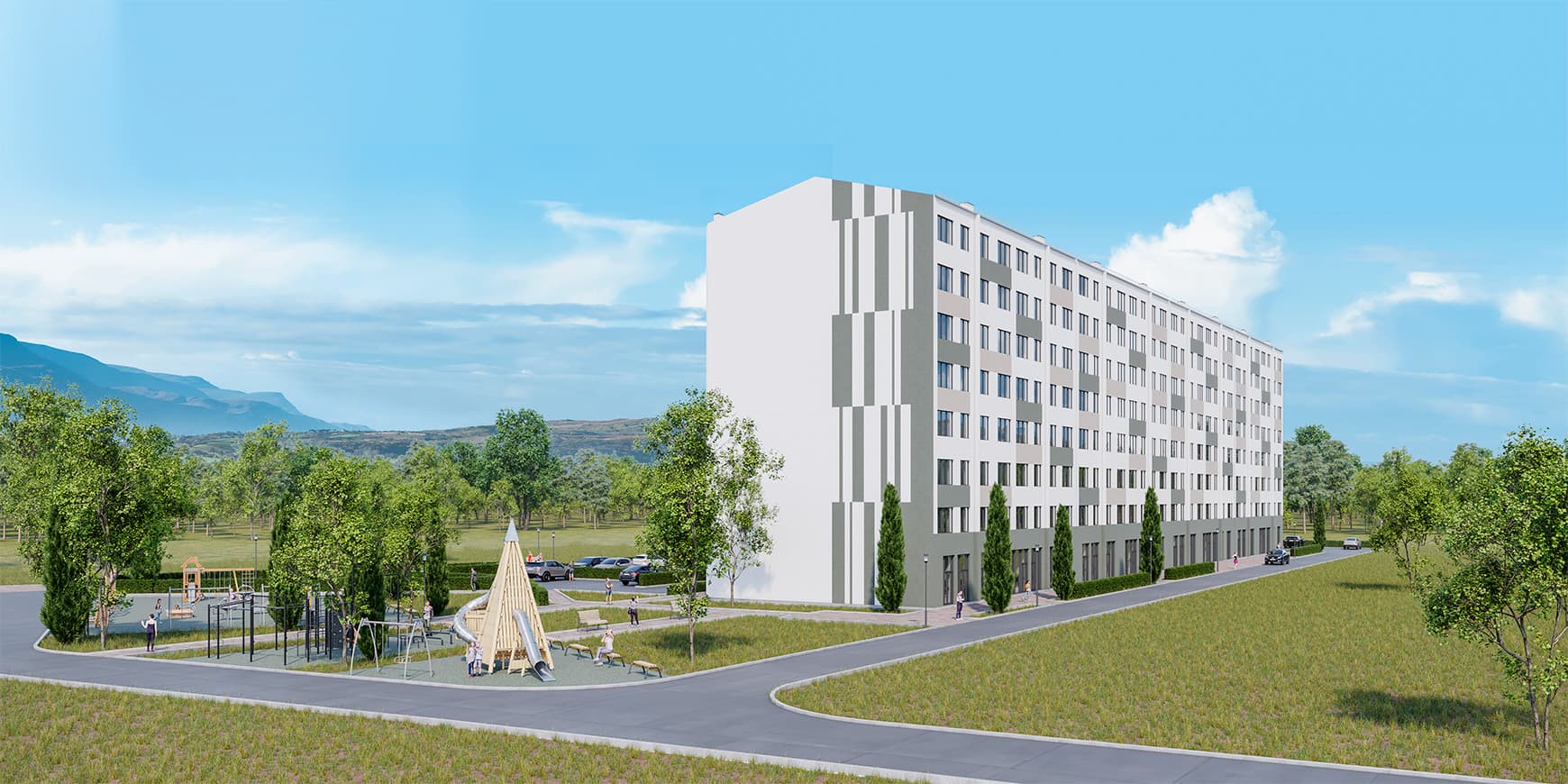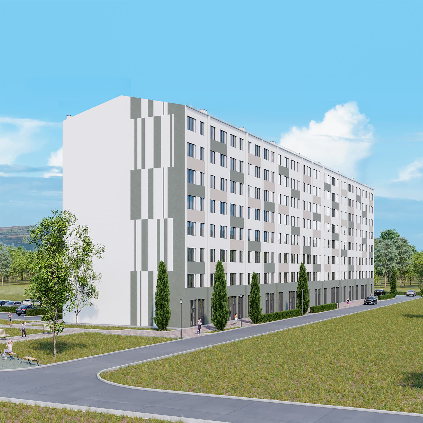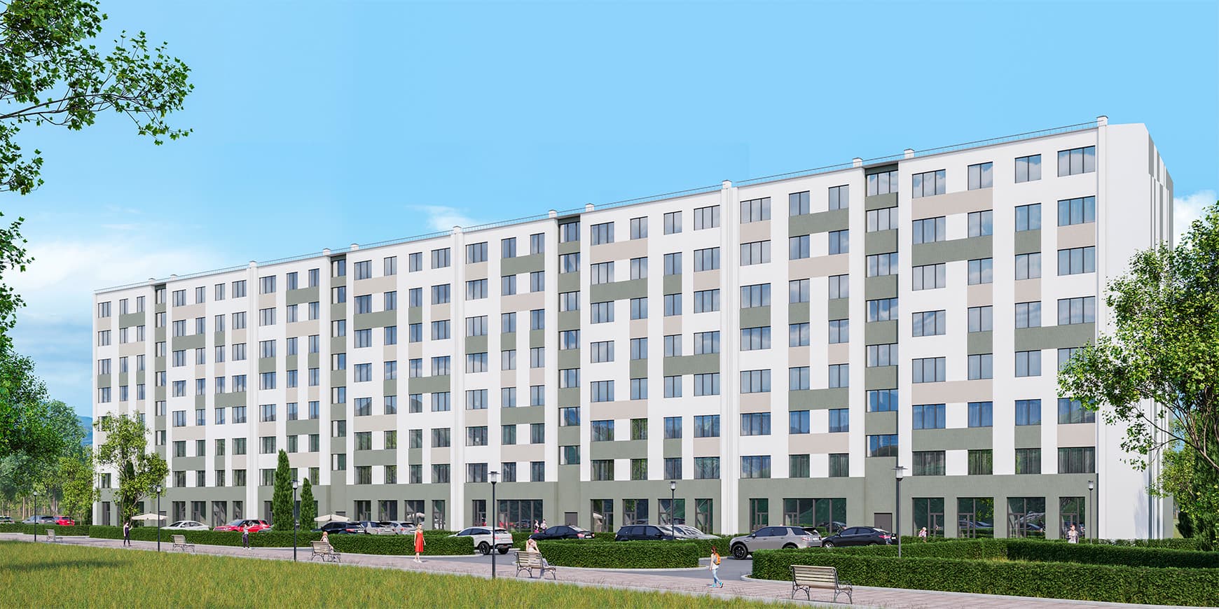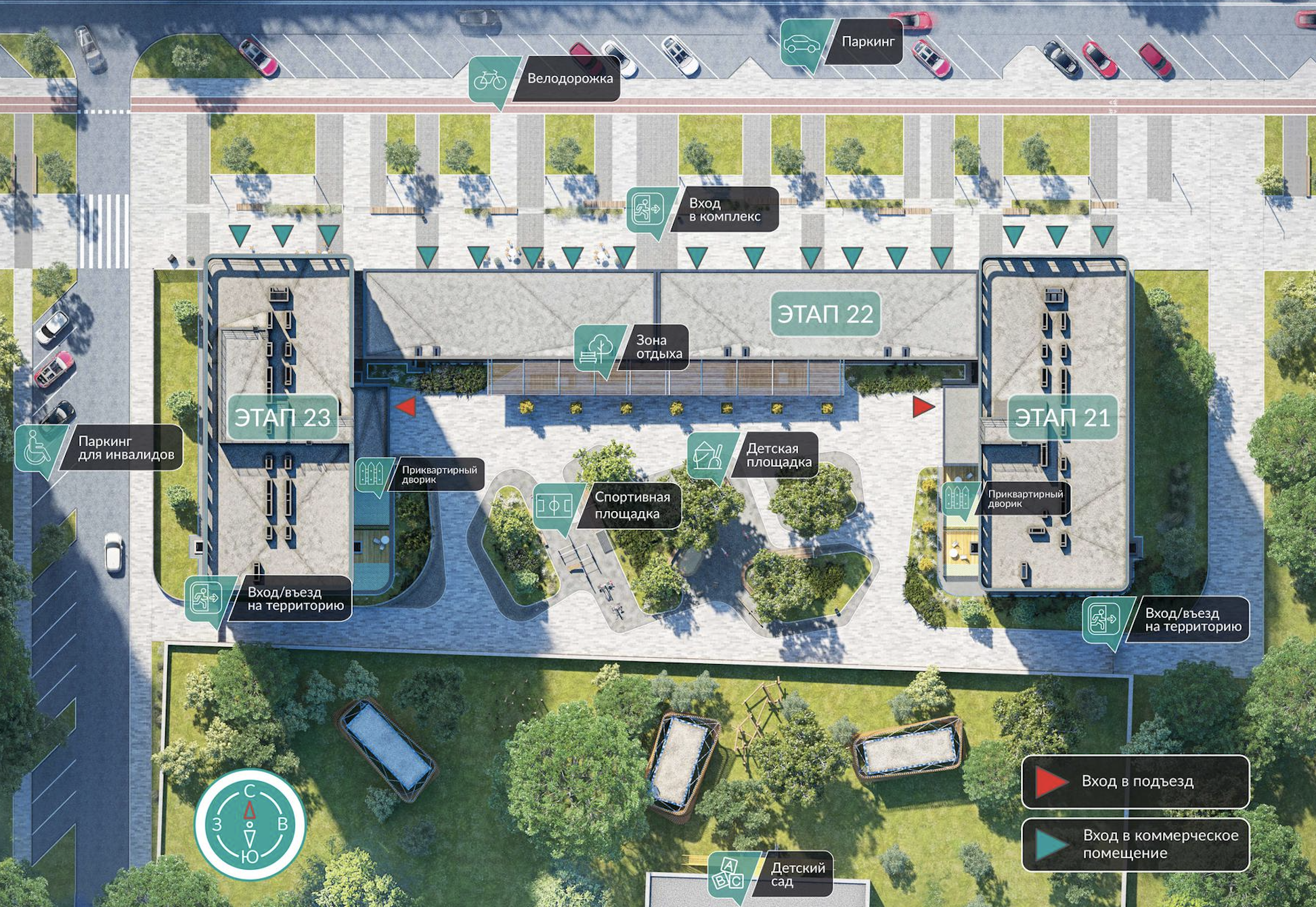 Променадная аллея-парк – доминанта микрорайона. Это главная пешеходная улица, с театральной площадкой, велодорожкой, лаунж и йога зонами.